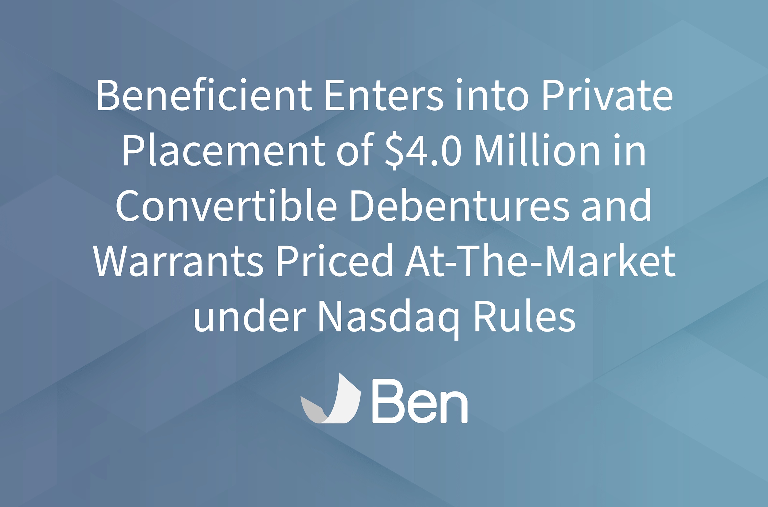 Dallas, TX. – August 7, 2024 (GlobeNewswire) – Beneficient (NASDAQ: BENF) (“Ben” or the “Company”), a technology-enabled financial services holding company that provides liquidity, primary capital solutions and related trust and custody services to holders of alternative assets, today announced that it has entered into a securities purchase agreement (the “Securities Purchase Agreement”) with YA II PN, LTD (“Yorkville”), pursuant to which the Company agreed to issue and sell to Yorkville, convertible debentures in an aggregate principal amount of up to $4,000,000 (the “Convertible Debentures”) and warrants (the “Warrants”) to purchase up to 1,325,382 shares of the Company’s Class A common stock, par value $0.001 per share (the “Common Stock”), at an exercise price of $2.63. The Company issued $2,000,000 in aggregate principal amount of Convertible Debentures and Warrants to purchase up to 662,691 shares of Common Stock upon signing of the Securities Purchase Agreement, and the Company will issue the additional Convertible Debentures and Warrants on or before the first business day after the date the registration statement with the Securities and Exchange Commission (the “SEC”) registering the resale of the Common Stock underlying the Convertible Debentures and Warrants is declared effective by the SEC. The Convertible Debentures do not bear interest, subject to a potential increase to 18.0% per annum upon the occurrence of certain events of default, mature on February 6, 2024, and may be redeemed at a premium any time prior to maturity at the Company’s election, subject to conditions. The Convertible Debentures will be issued at an original issue discount of 10%.