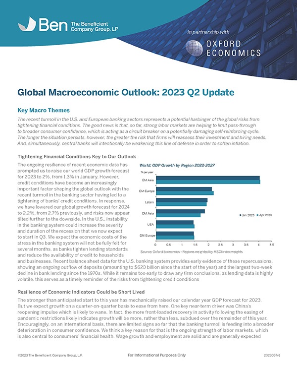 - Tightening Financial Conditions. Despite a bump in our forecast for world GDP growth, banking chaos in the U.S. and Europe and the resulting tightening of credit conditions could continue to cascade through the year.