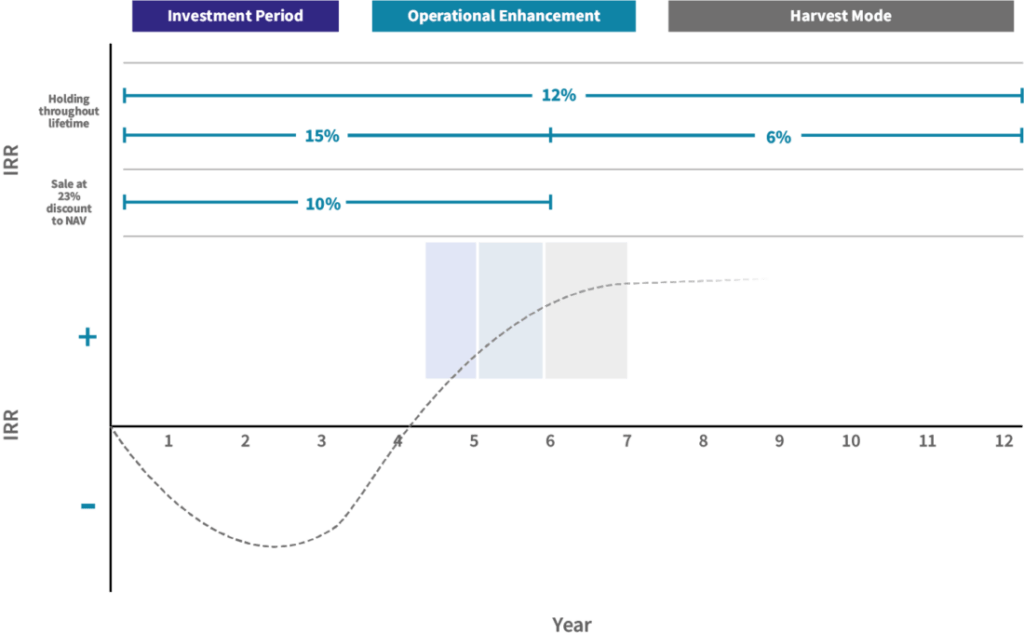 Note: The illustration depicts and assumes an institutionally managed diversified alternative investment earning 12% over its full life, earning 15% in its first six years and 6% in its remaining years for a total illustrative IRR of 12% over its life. An investor which sells the asset at the 6th year at a 23% discount (or 77% of NAV) would have earned approximately 10% over the 6 year holding period. This illustration assumes 2nd quartile performing funds net of fees, expenses and profit payments to sponsors investing in diversified alternative assets as tracked by Preqin. The illustration presents only a hypothetical investment outcome and does not predict future results or investment performance.